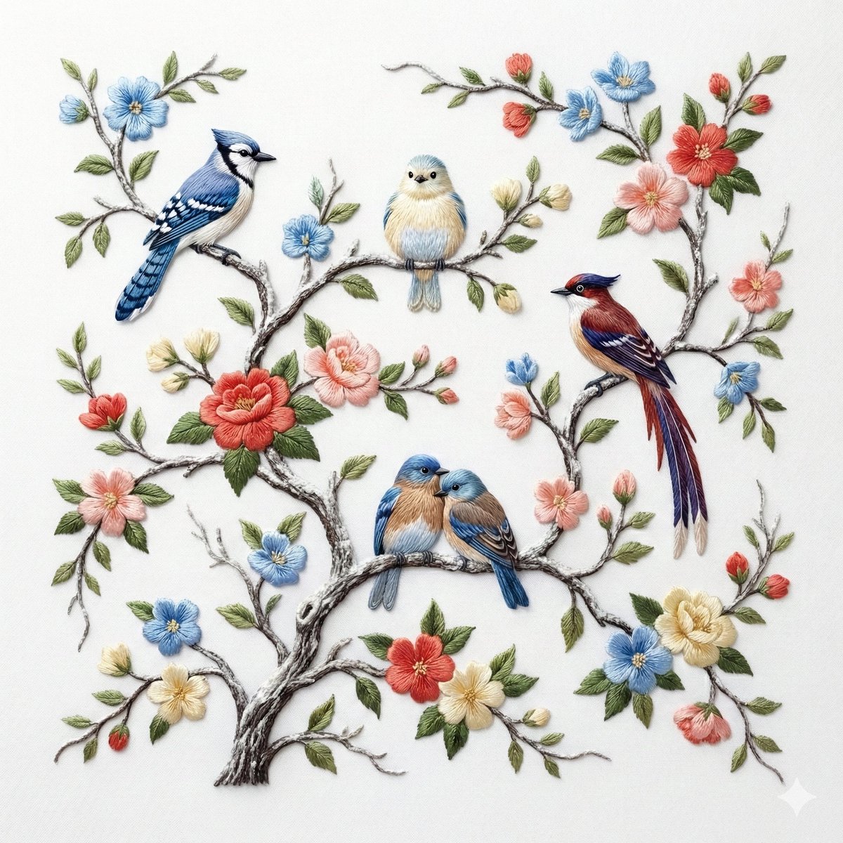 Intricate Embroidery of Birds on Frosted Flowering Branch