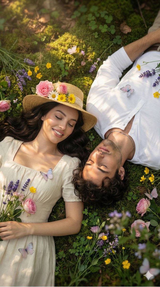 "setting": "lush bed of green moss and wildflowers",