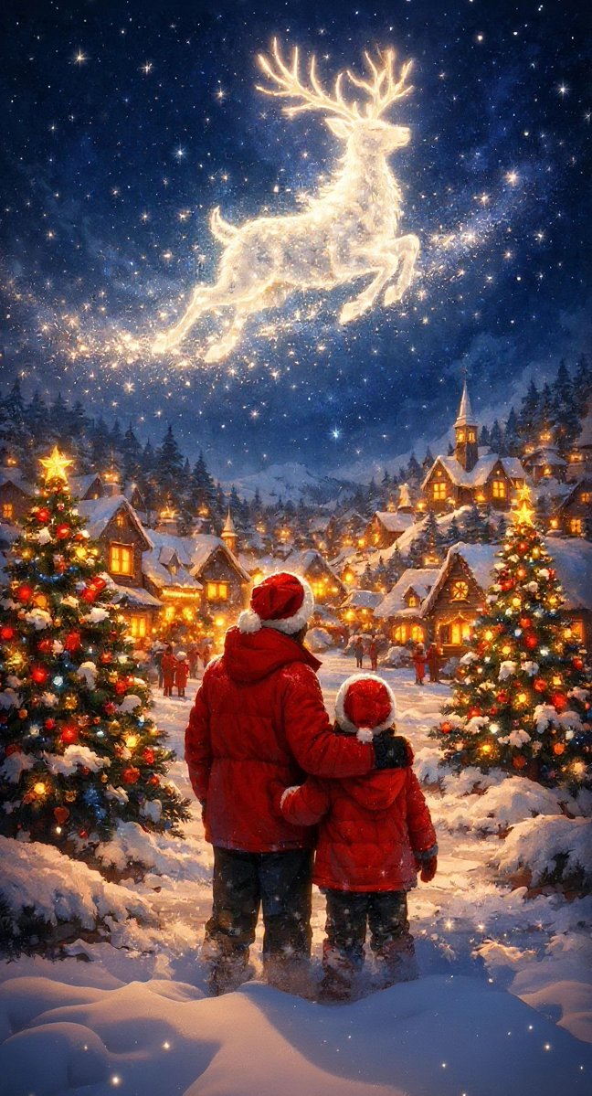 (masterpiece:1.4), (best quality:1.3), (highly detailed:1.2), 8k, Christmas village, snowy landscape, (magical glowing reindeer in night sky:1.4), (pe
