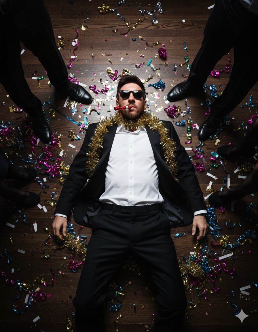 The person attached in the image ( Keep the face of the person 100% accurate from the reference image ) is lying flat on their back on a dark wooden f