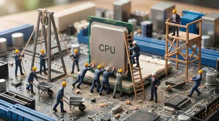Miniature Workers on a Giant Computer Motherboard Diorama