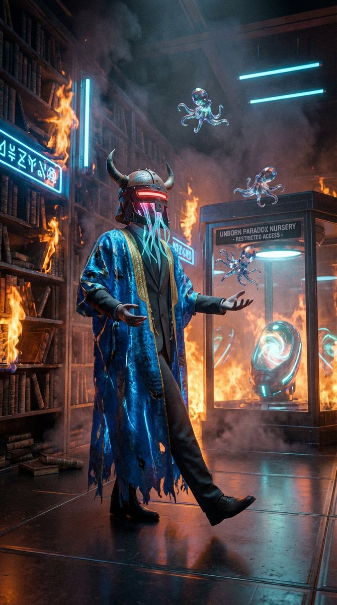 [subject] moonwalking through [location], wearing glowing Bedouin silks and a robotic Viking helmet, juggling floating crystal octopuses.