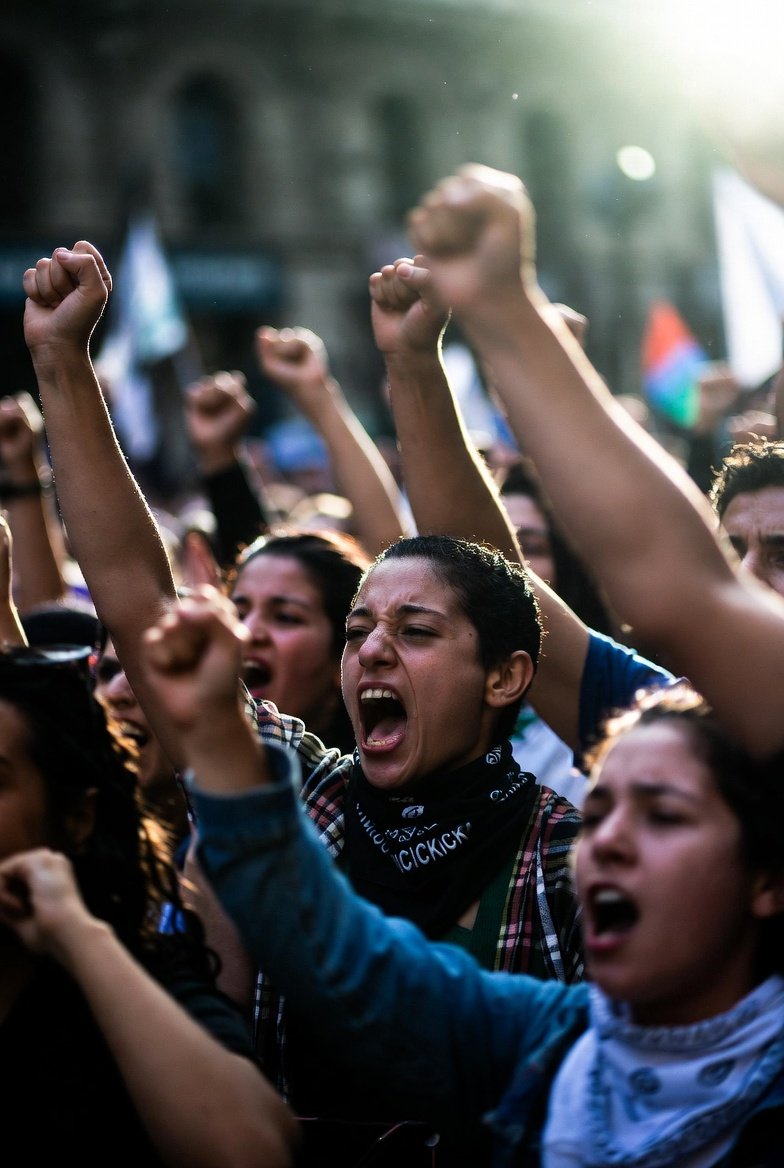 Powerful protest scene, bold cinematic style - defiant crowd with raised fists, intense expressions, dramatic lighting, gritty realism, revolutionary