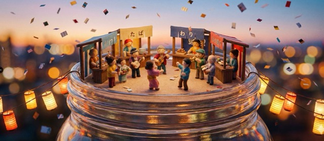 Prompt:A band of tiny [CHARACTERS] throwing a colorful festival on the rim of an enormous [EVERYDAY_OBJECT]. Paper lanterns strung on wire, confetti m