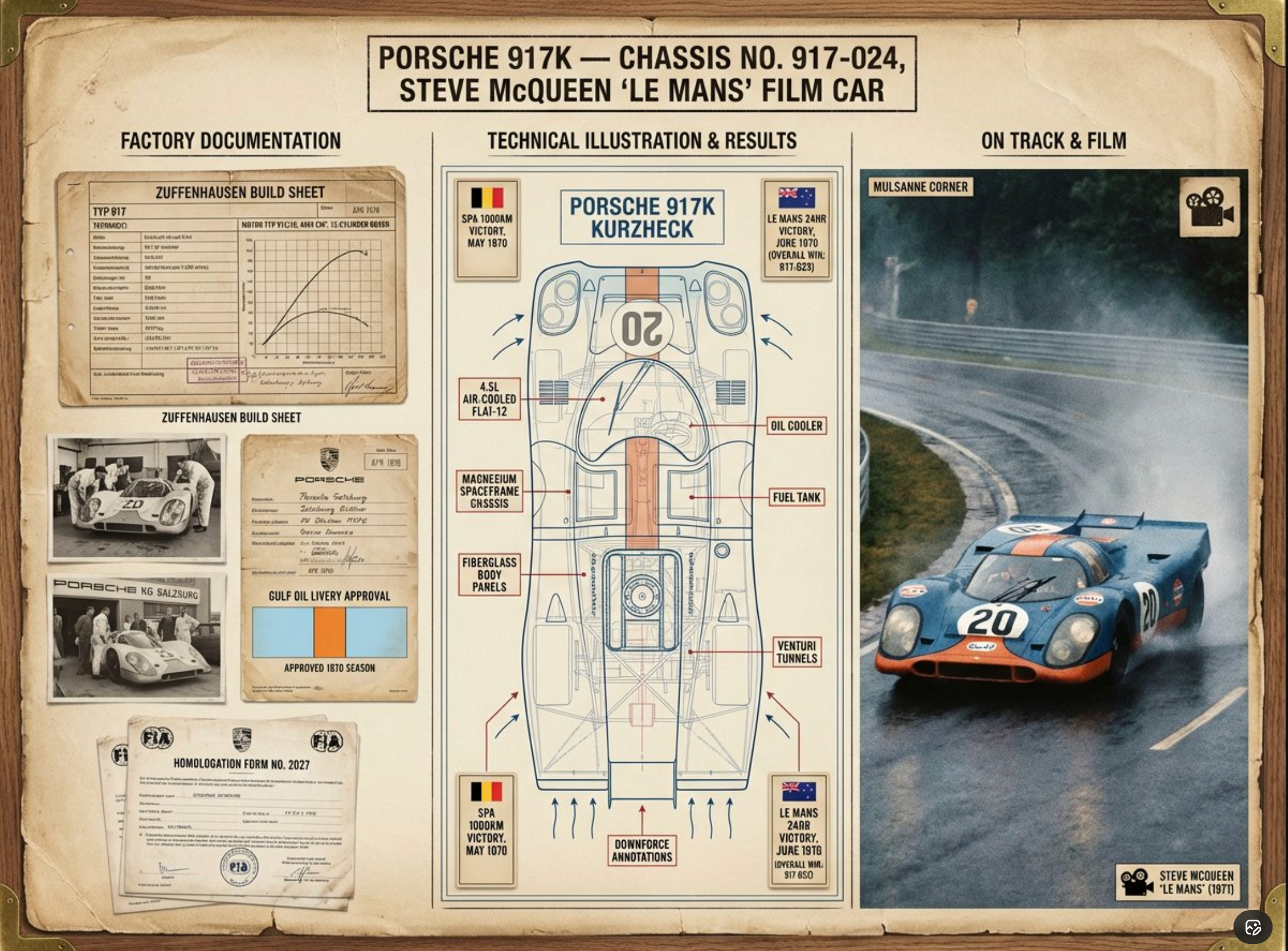 Prompt:A marque historian's documentation board for [VEHICLE] - [MODEL / VARIANT / YEAR]. Left section: factory documentation including original speci