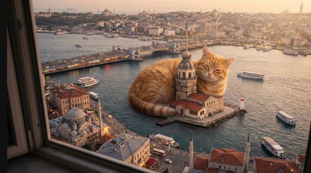 Prompt:A scene where 【Tokyo Tower】is occupied by a super gigantic, adorable 【cat】.The surrounding buildings appear as small as toy models, while the 【