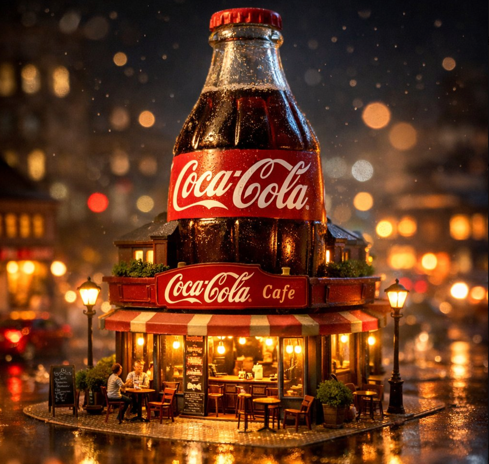 Prompt:A surreal miniature city scene where a giant soda bottle transforms into a cozy café building. The bottle forms the upper structure while the g
