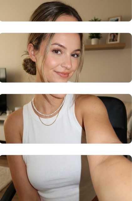 Prompt:A young woman with light-colored skin and dark blonde/light brown hair casually tied in a low or mid messy bun, with a few loose strands framin