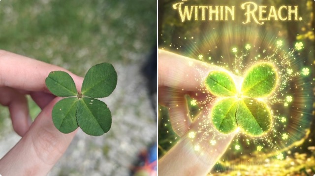 Prompt:Create a dazzling imagination of happiness out of this four-leaf clover, make the picture stand out, be truly majestic and scream that happines