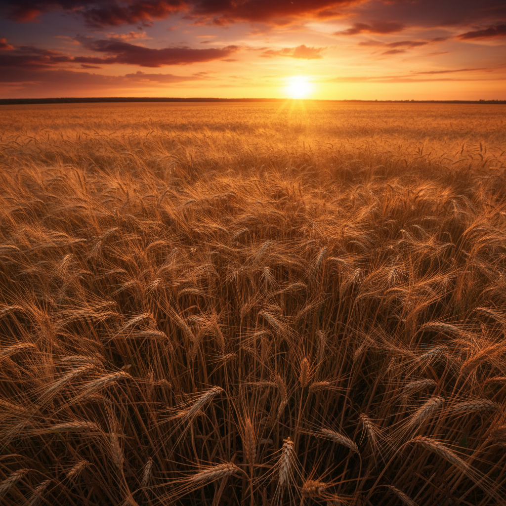 Prompt:Golden wheat field swaying in wind at sunset,...