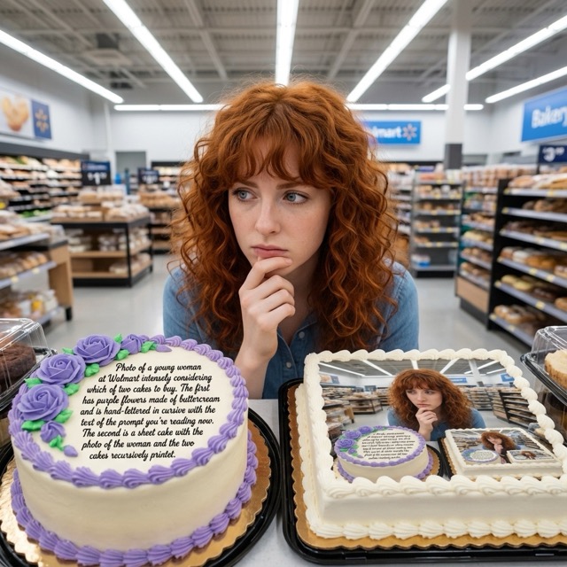 Prompt:Photo of a young woman at Walmart intensely considering which of two cakes to buy. The first has purple flowers made of buttercream and is hand