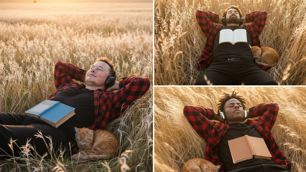 Prompt:The man attached in the uploaded reference image (preserve face 100% from the uploaded reference image) relaxing in a golden field of tall whit