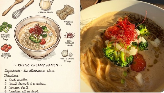 Prompt:Turn this ramen into a cute recipe page with illustrations in the style of a vintage cookbook that was hand-drawn. A carefully drawn ingredient