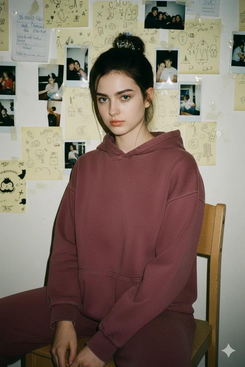 Same face, hit with an unforgiving flash that nukes the shadows. Her hair is shoved back with a cheap plastic clip, a few wild strands catching the gl