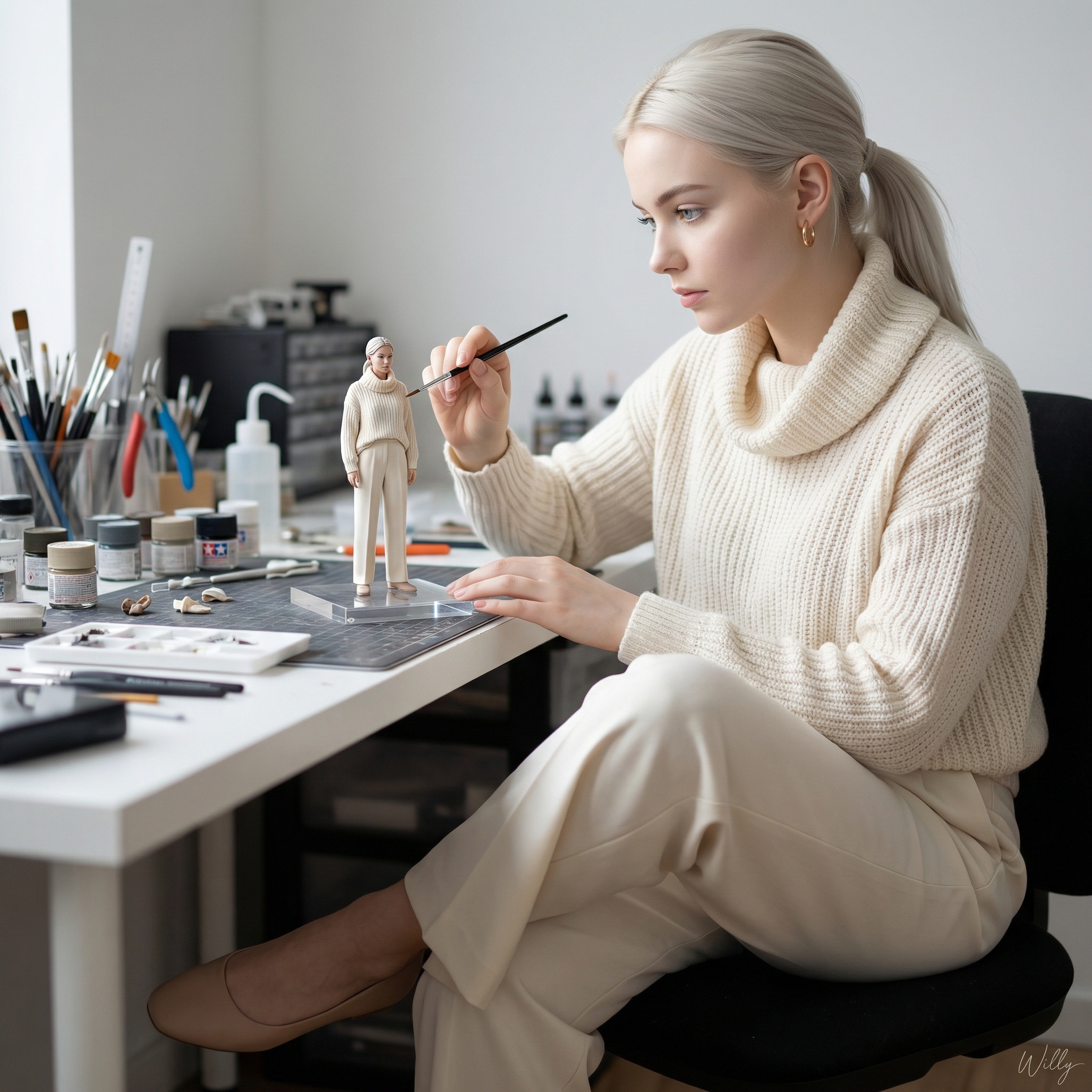 Ultra-realistic cinematic studio scene of a young Caucasian woman in her early 20s carefully painting a highly detailed miniature human figurine that