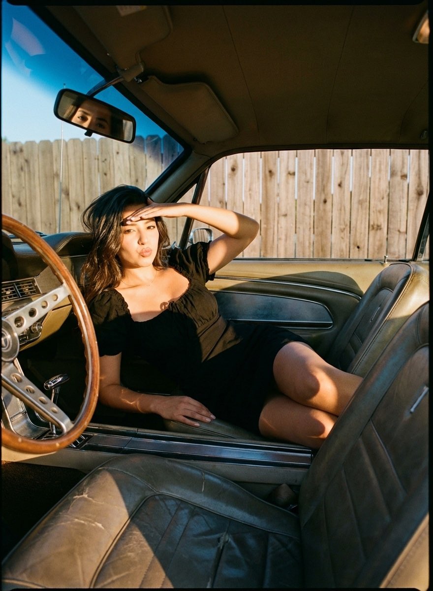 Young woman in vintage car during golden hour (35mm film)